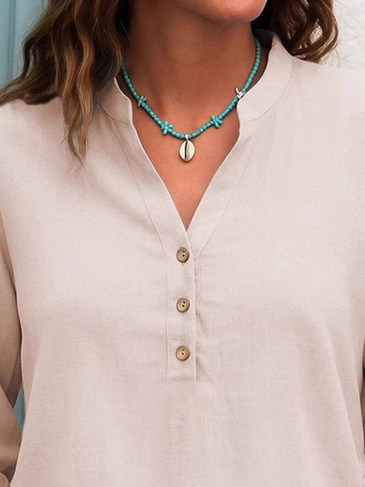 Full Size Button Detail Notched Long Sleeve Blouse Plus Size